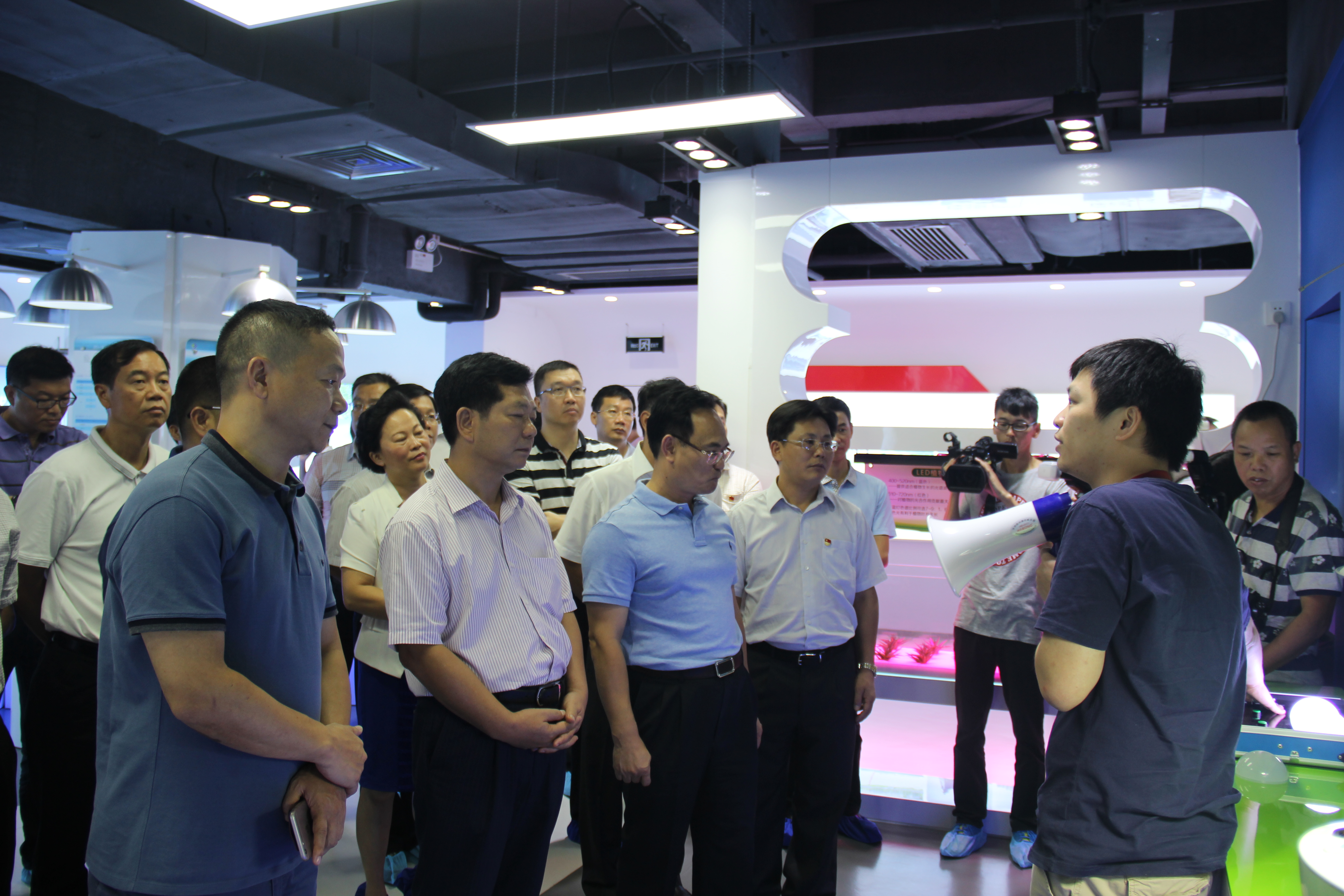 2016年7月19日上午,開平市市黨政領導班子一行80余人,在副市長、高新區黨工委書記、管委會主任、江海區委書記梁許贊和江海區委副書記、區長周惠紅等人員的陪同下,來到德力光電進行考察工作。